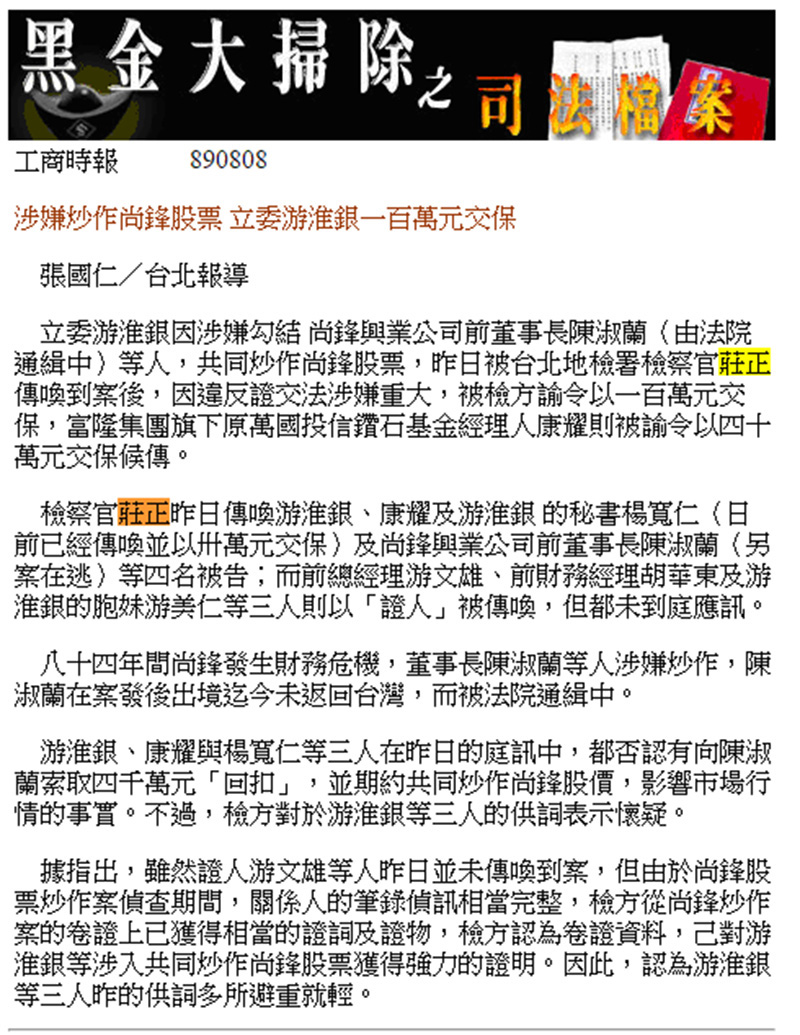 2000.08.08 涉嫌炒作尚鋒股票 立委游淮銀一百萬元交保   回上一頁