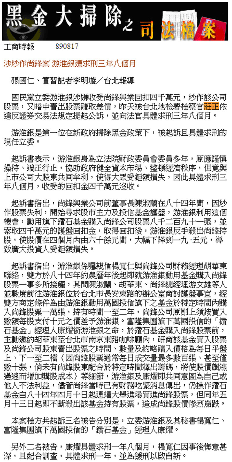 2000.08.14 涉炒作尚鋒案 游淮銀遭求刑三年八個月   回上一頁