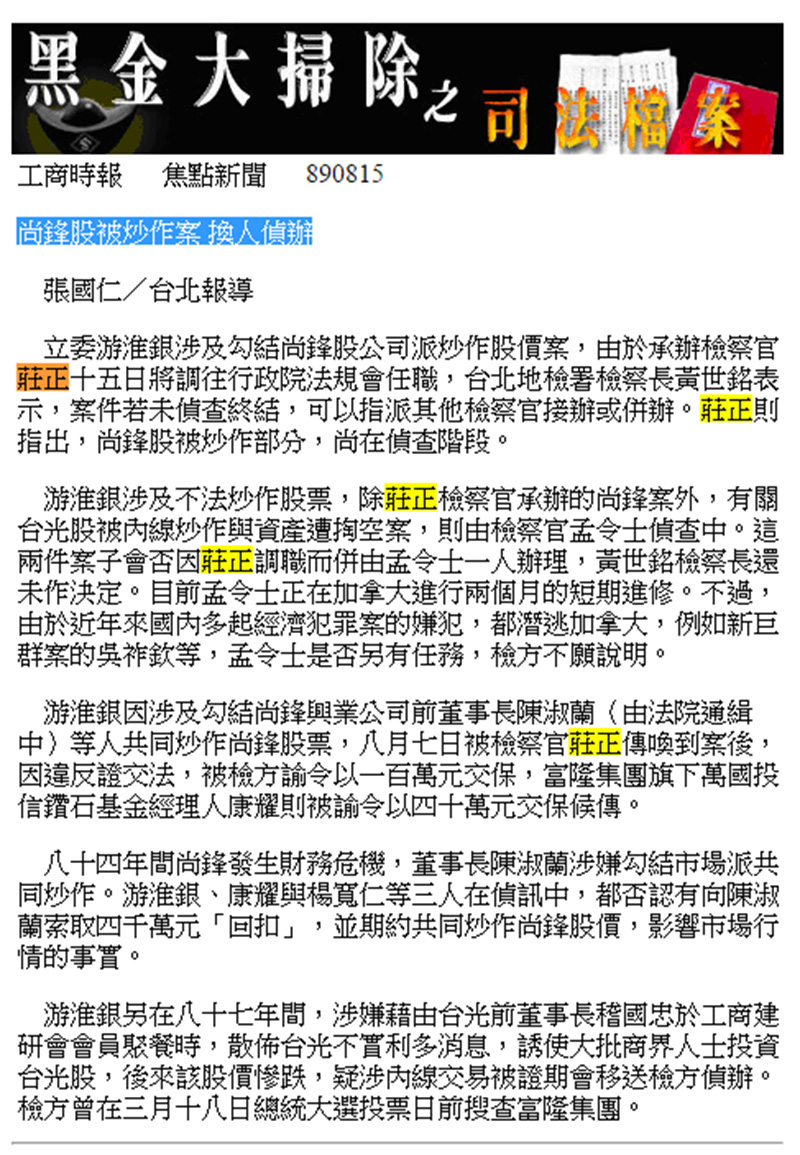 2000.08.15 尚鋒股被炒作案 換人偵辦   回上一頁
