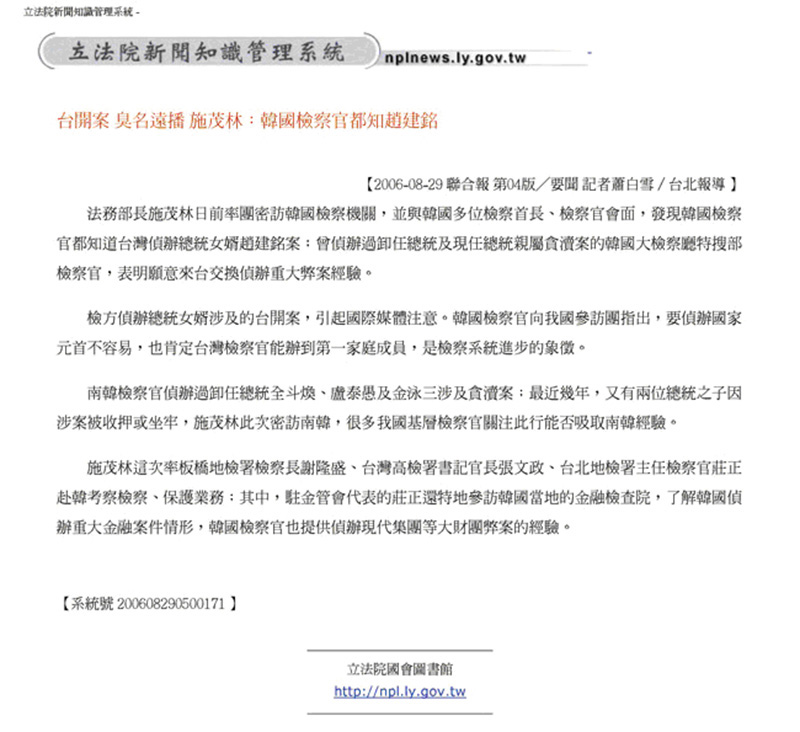 2006.08.29 台開案 臭名遠播 施茂林:韓國檢察官都知道趙建銘   回上一頁