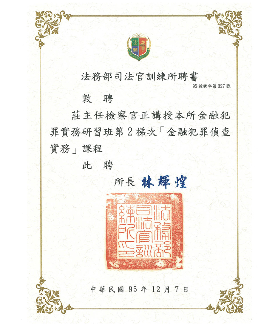 2006.12.07|95教聘字第327號 法務部司法官訓練所-金融犯罪偵查實務課程聘書 回上一頁