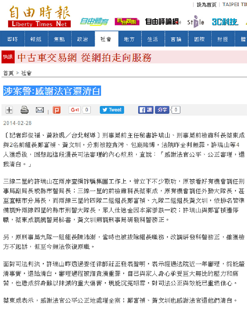 2014.02.28 涉案警:感謝法官還清白  回上一頁
