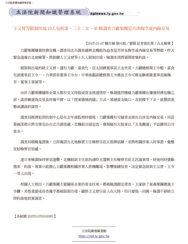 2007.01.10 王又曾等限制出境 19人包括妻、三子二女、弟 檢調查力霸集團是否涉掏空或內線交易   回上一頁