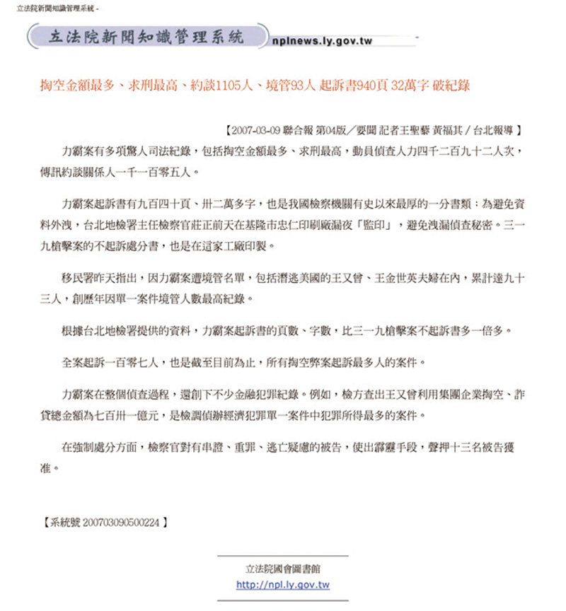 2007.03.09 掏空金額最多、求刑最高、約談1105人、境管93人 起訴書940頁 32萬字 破紀錄   回上一頁