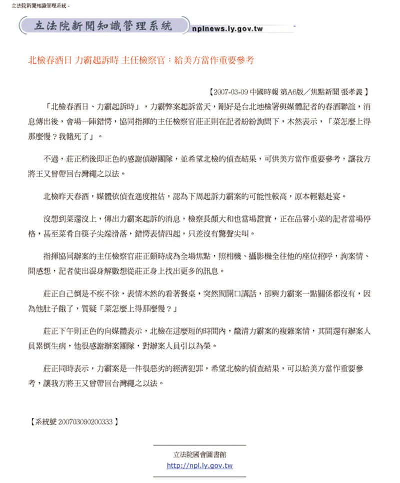 2007.03.09 北檢春酒日 力霸起訴時 主任檢察官:給美方當作重要參考   回上一頁