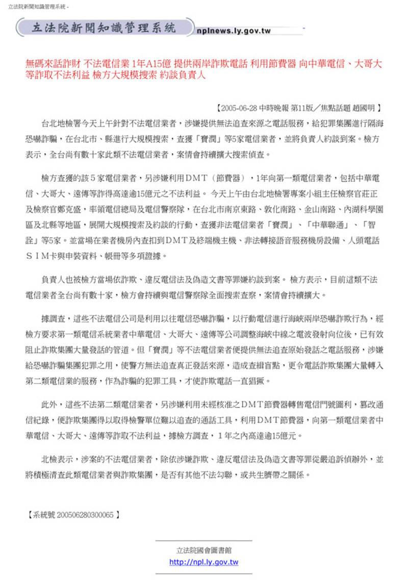 無碼來話詐財 不法電信業 1年A15億 提供兩岸詐欺電話 利用節費器 向中華電話、大哥大等詐取不法利益 檢方大規模搜索 約談負責人   回上一頁