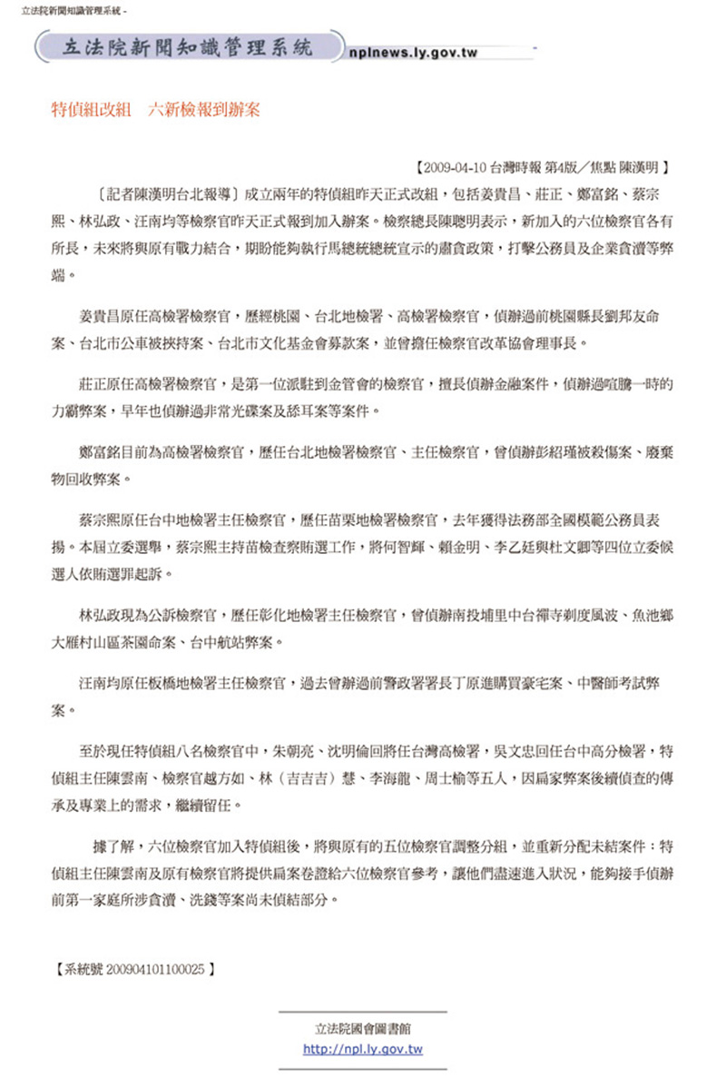 2009.04.10 特偵組改組 六新檢報到辦案   回上一頁