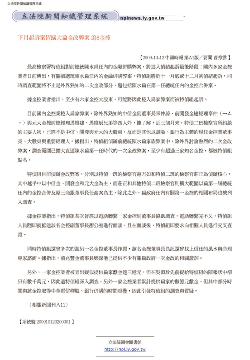 2009.10.12 下月起訴案情擴大扁金改弊案 追6金控   回上一頁