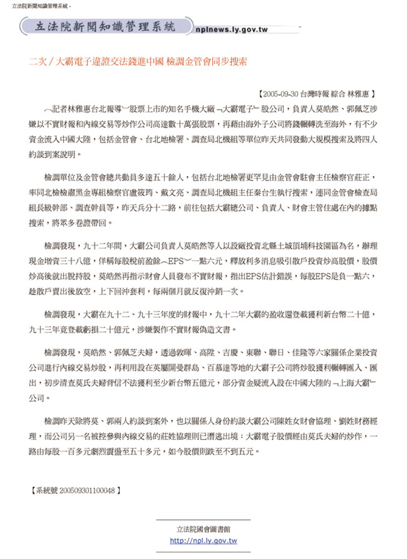 2005.09.30 二次/大霸電子為證交法錢進中國 檢調金管會同步搜索  回上一頁