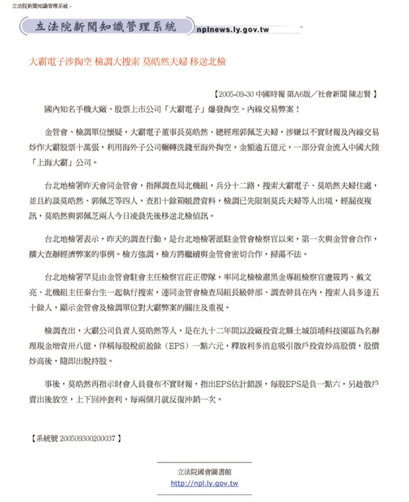 2005.09.30 大霸電子涉掏空 檢調大搜索 莫皓然夫婦 移送北檢   回上一頁